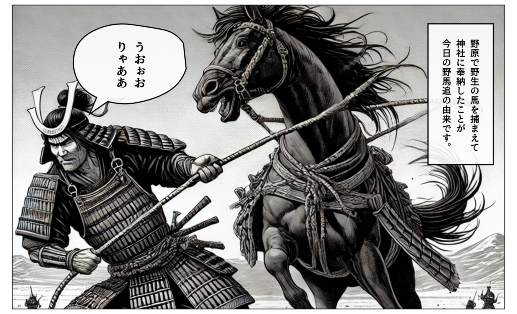 It is believed to have originated when Taira no Masakado (who was called Soma Kojirō in his childhood) captured wild horses on the plains of Koganehara in the Shimōsa Province’s Katsushika District (an area that corresponds to present-day Matsudo and Nagareyama in Chiba Prefecture) and dedicated them to a shrine.