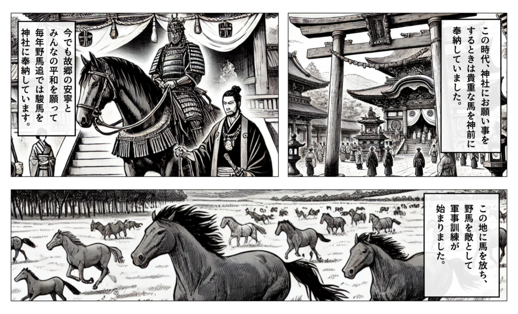 Even today in Sōma, as prayers for the safety of the homeland and the peace of its residents, fine horses are dedicated to the shrine each year during the Nomaoi festival.