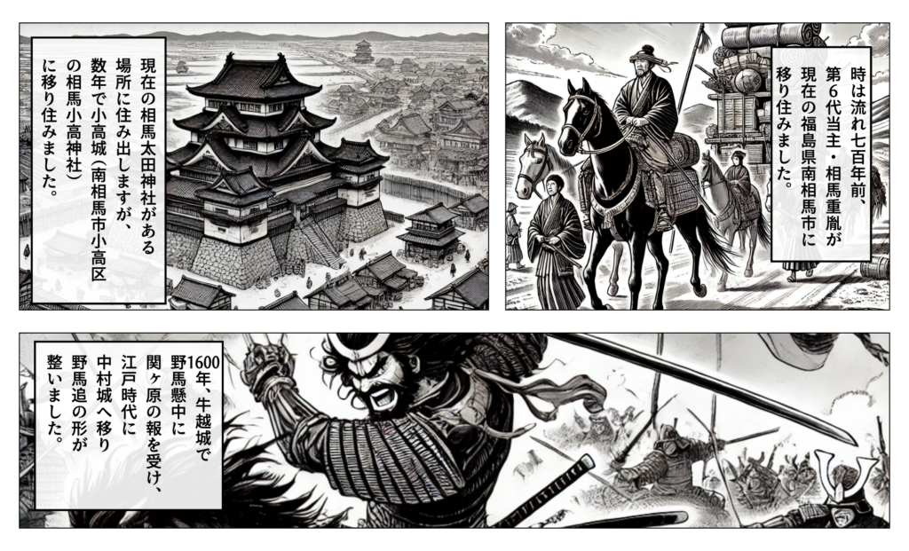 When the Edo period began, the residence was moved to Nakamura Castle (the present-day site of Sōma Nakamura Shrine in Sōma City), which thereafter became the main stronghold of the Sōma clan until the Meiji era. From around this period, we begin to see the early form of today’s *Sōma Nomaoi*.